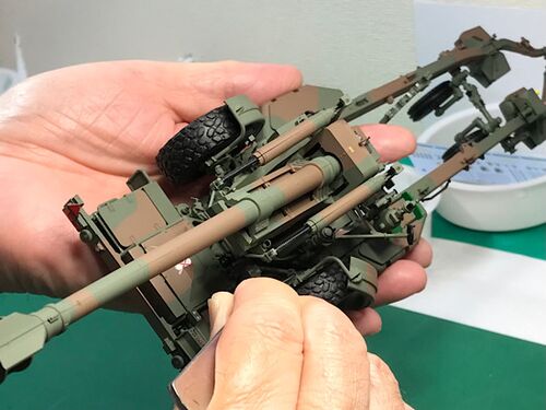 夫が作っていた「1/35 陸上自衛隊 155mm りゅう弾砲 FH-70」が完成しました。 このページは、走行姿勢の写真を載せます。 完成したと言うので撮影しやすいように並べてもらいました。 横から見ています。 外したり動かしたり出来ます。※写真を撮っておけば良…